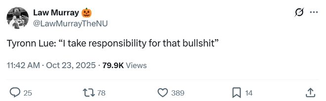 面对这样一场让人大跌眼镜的惨败,泰伦卢赛后也第一时间揽责,公开表示:“责任在我,我们整场打得就像狗屎一样。”